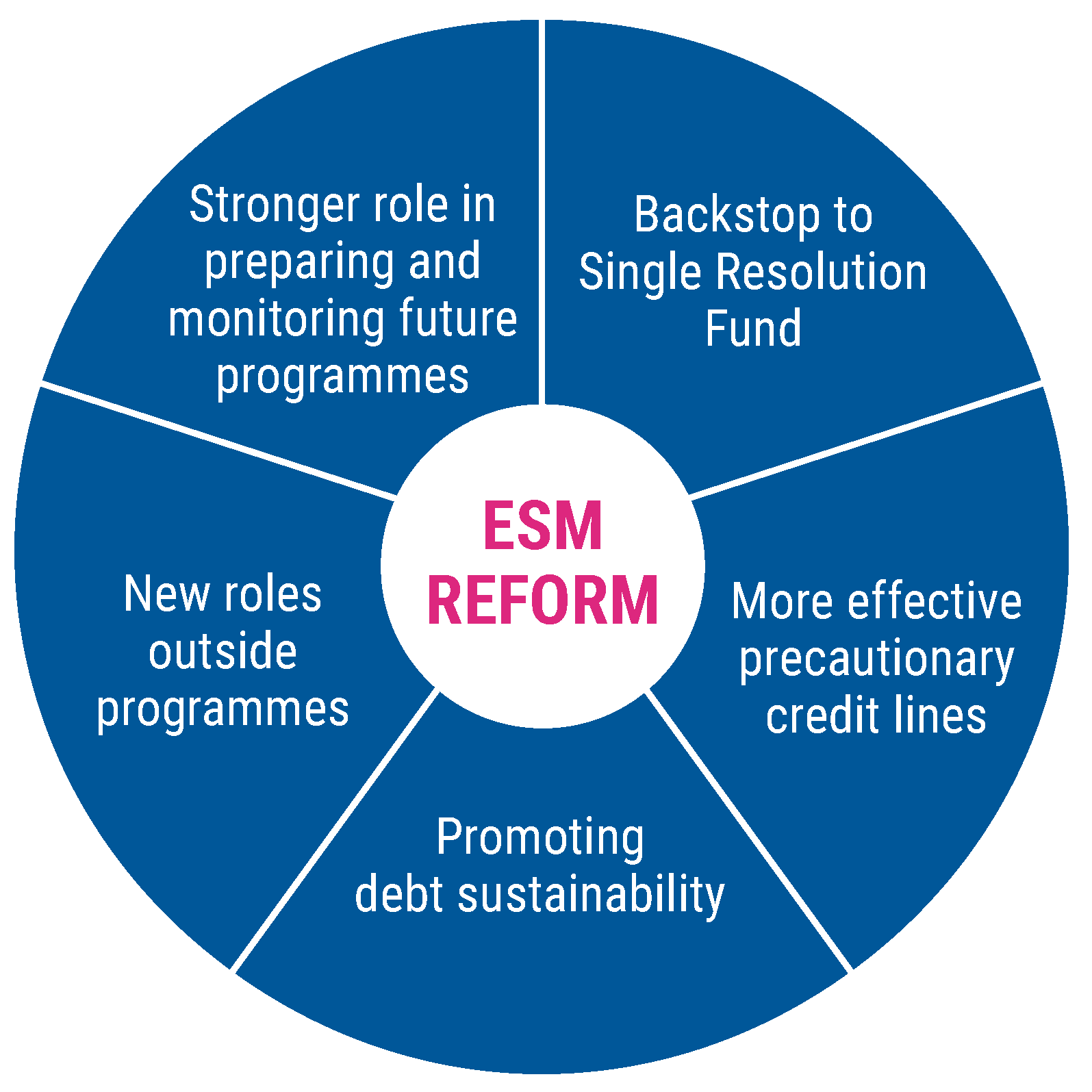 The Eurogroup agrees in principle on ESM reform, subject to the conclusion of national procedures. This includes the further development of ESM instruments, enhancing the ESM’s role, and setting up a common backstop for the Single Resolution Fund.