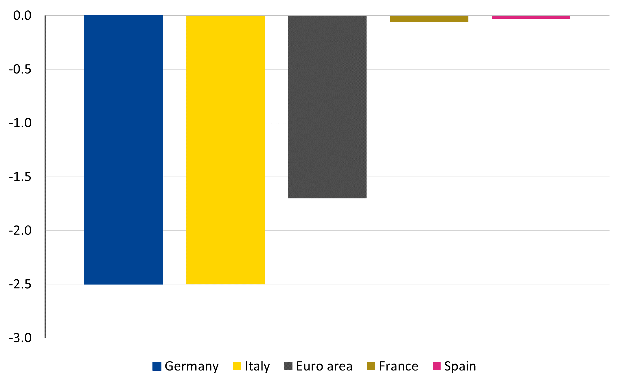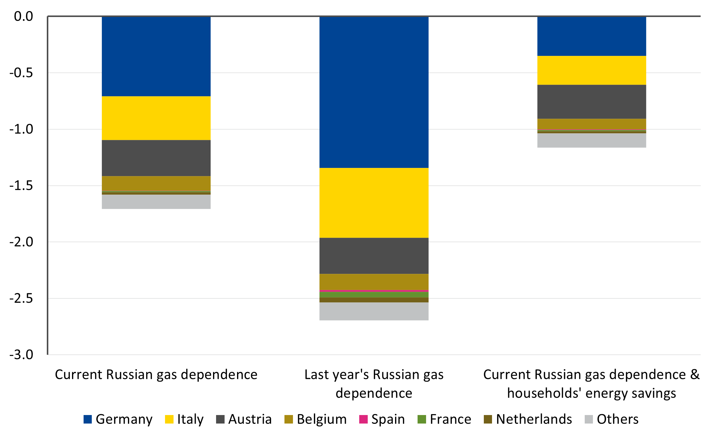 Notes: The figure shows the output losses of a Russian gas import stop and consequent rationing of gas by most energy-intensive sectors for the largest euro area economies and euro area aggregate. The output losses are shown as percentage deviation from a baseline with no gas impairment. The assumed Russian gas dependency is the one observed today.