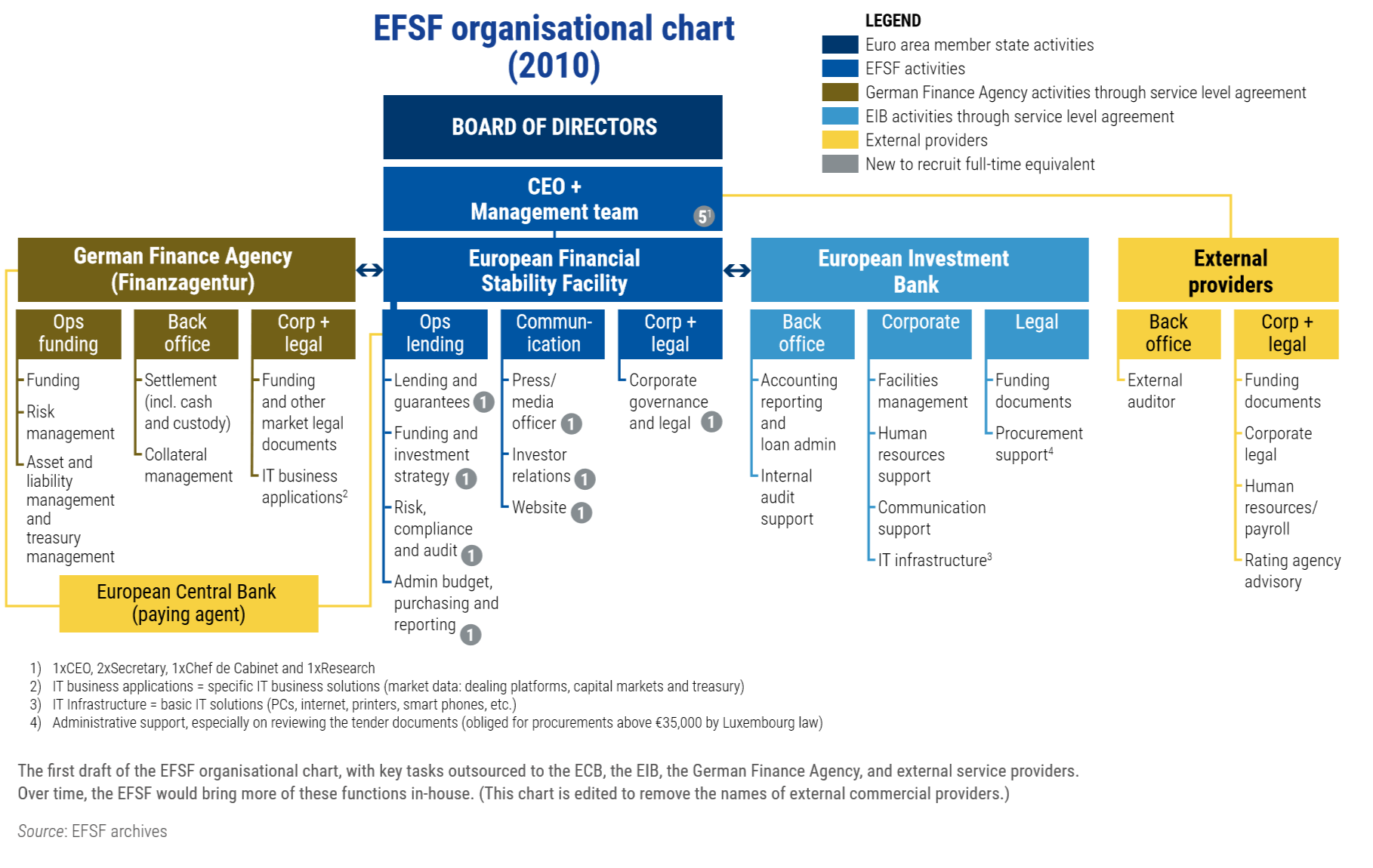 The EFSF was originally conceived of as a 12-person shop, as shown by the institution’s founding organisational chart. This staffing framework was one of the first data points Regling could show to a curious yet cautious global investor base as part of the long process of building confidence. In July 2010 – before the firewall was fully up and running – Regling took the chart to an Asian investors’ conference in Beijing hosted by Singapore’s sovereign wealth fund.