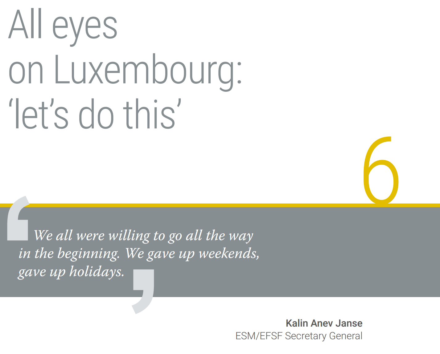This corporate structure had some interesting requirements. For example, Heinrich remembers having to read speaking notes prepared by the EFSF’s legal advisors at the start of every meeting or conference call, and he said he became an overnight expert in Luxembourg’s corporate law.
