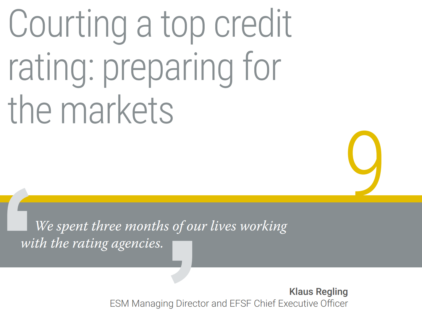 Political and technical compromises in hand, in September 2010 Regling and Strauch secured the best possible provisional first-time credit rating for the EFSF from each of the top three: AAA from Standard & Poor’s, Aaa from Moody’s, and AAA from Fitch.