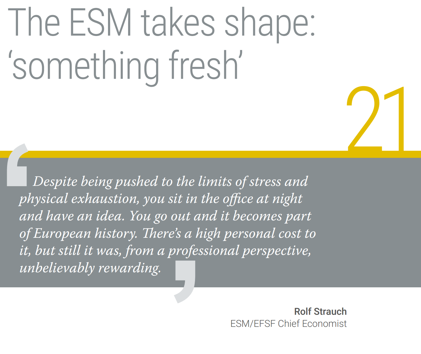 Although the euro economy is enjoying relatively favourable economic conditions today, in part due to the work of the EFSF and ESM, everyone who works at the firewall is keenly aware of what was so recently at risk. The ESM’s Giammarioli grew up in Italy with an Italian father and Finnish mother, at a time before Finland joined the EU. Europe’s past was etched into his family’s history. ‘My two families, 3,000 kilometres apart, suffered greatly during World War II,’ Giammarioli said. ‘Europe has guaranteed the last 75 years of peace, prosperity, and growth. In the crisis, that came under threat. I see myself as a small actor in this big picture, trying to help principles that were developed decades ago move forward.’