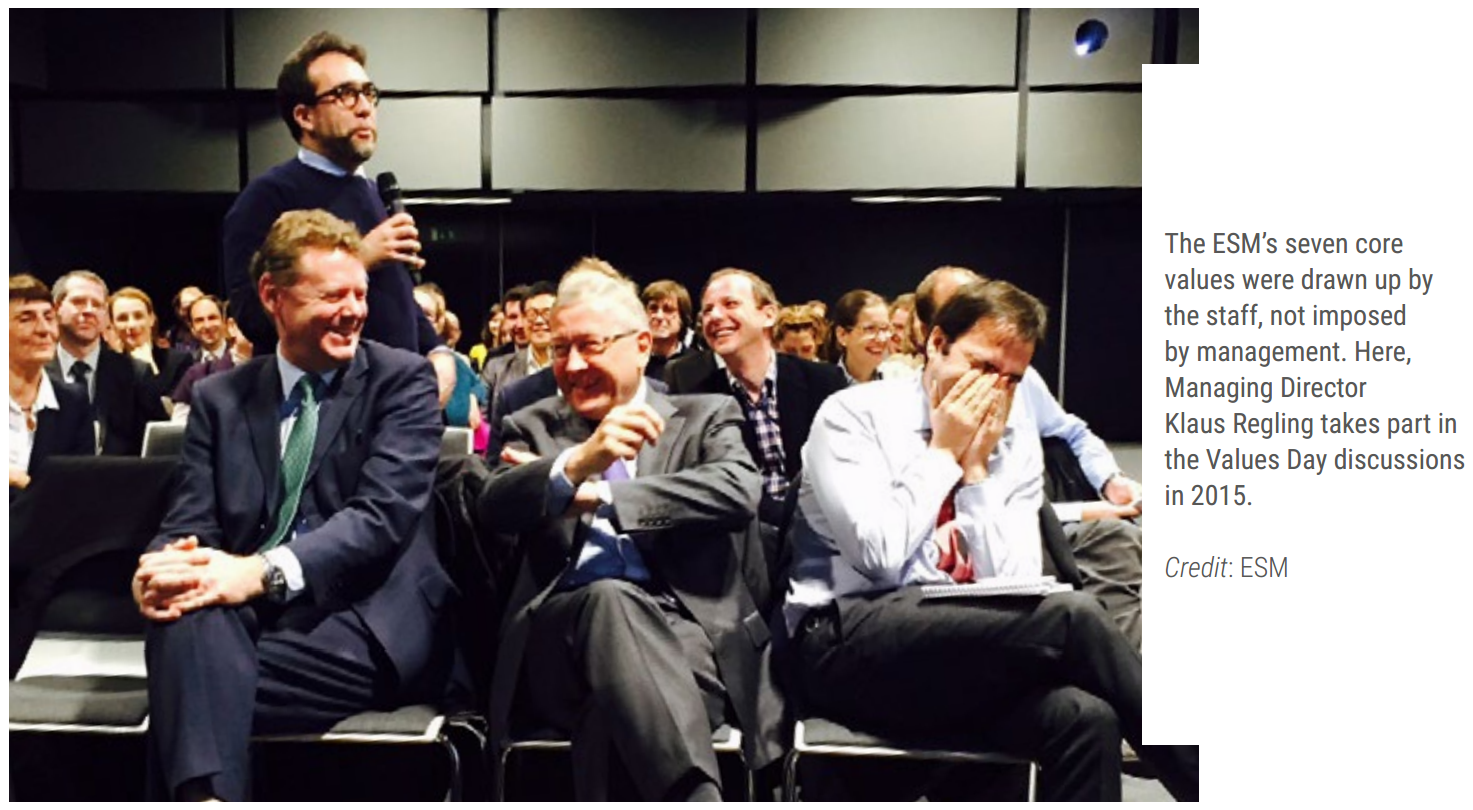 The senior management endorsed the conclusions from the online survey and follow-up dialogue sessions. Importantly, the resulting cultural commitments evolved from within the organisation instead of being imposed from above. Regling praised Henderson’s approach to shaping the internal discussions. ‘She said if you don’t work on building your own culture by design, you will still have a culture by default – but not usually the one you want,’ Regling said.