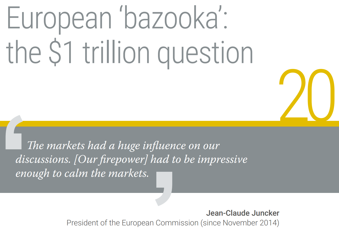 Unfortunately, the headline number’s foundations were not completely sturdy. Former ECB President Trichet put the problem succinctly: ‘The amount of money that was really mobilised was significantly more meagre than what was promised and, in my view, was one of the reasons why the Europeans lacked the level of credibility that would have been necessary given the circumstances.’