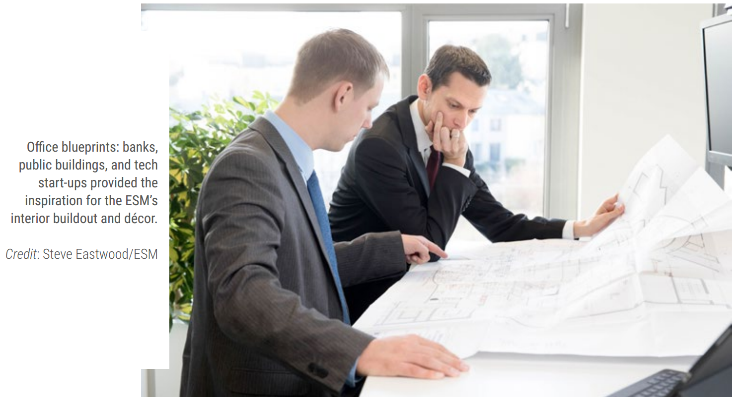 The office’s buildout and décor were constrained by two factors: ensuring staff could do their jobs come what may and safeguarding the security of the ESM’s people, infrastructure, computer, and communications systems.
