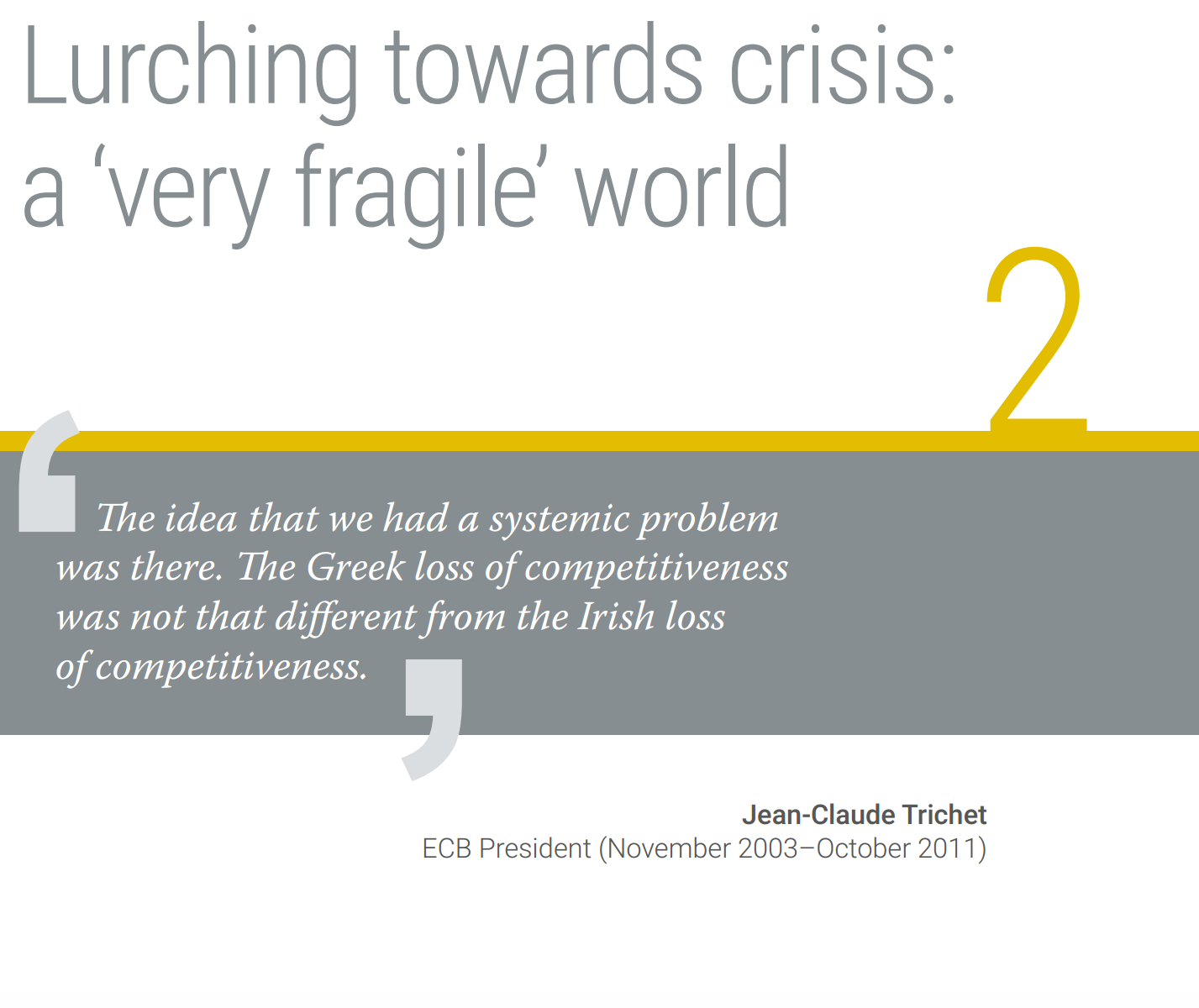 Although problems such as weak banks, high government debt, and inefficient labour markets were visible in 2008, the former ECB President Jean-Claude Trichet said that they were not yet appreciated: ‘It was absolutely clear that many countries had no understanding of the loss of competitiveness incurred by a large number of countries during the first decade of Economic and Monetary Union,’ he said.